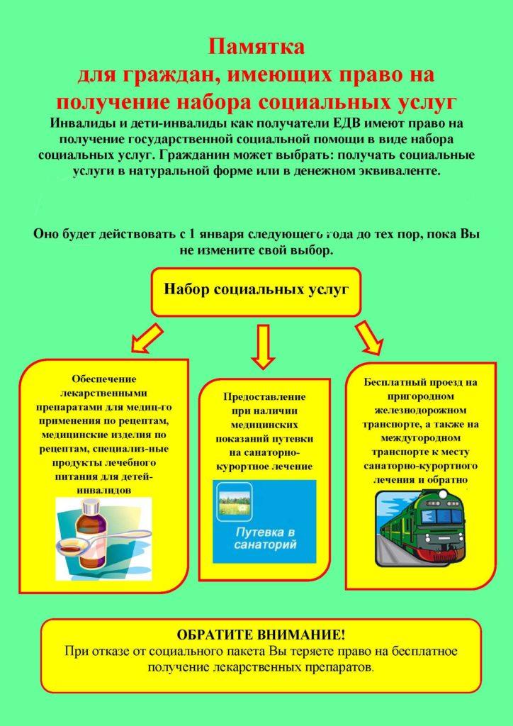 Набор социальных услуг включает в себя следующие социальные услуги: обеспечение необходимыми лекарственными препаратами, санаторно-курортное лечение и проезд на железнодорожном транспорте. Отказаться или вернуть право на соцпакет или на одну из указанных услуг можно один раз в год до 1 октября, при этом право возникает с 1 января следующего года.